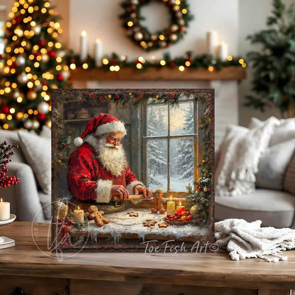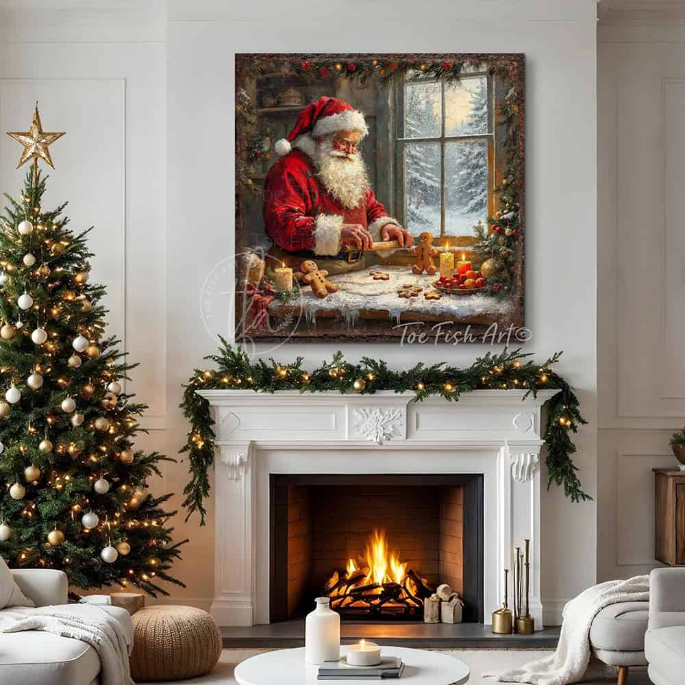 Santa Baking Gingerbread Cookies Christmas Wall Art | Cozy Holiday Kitchen Décor