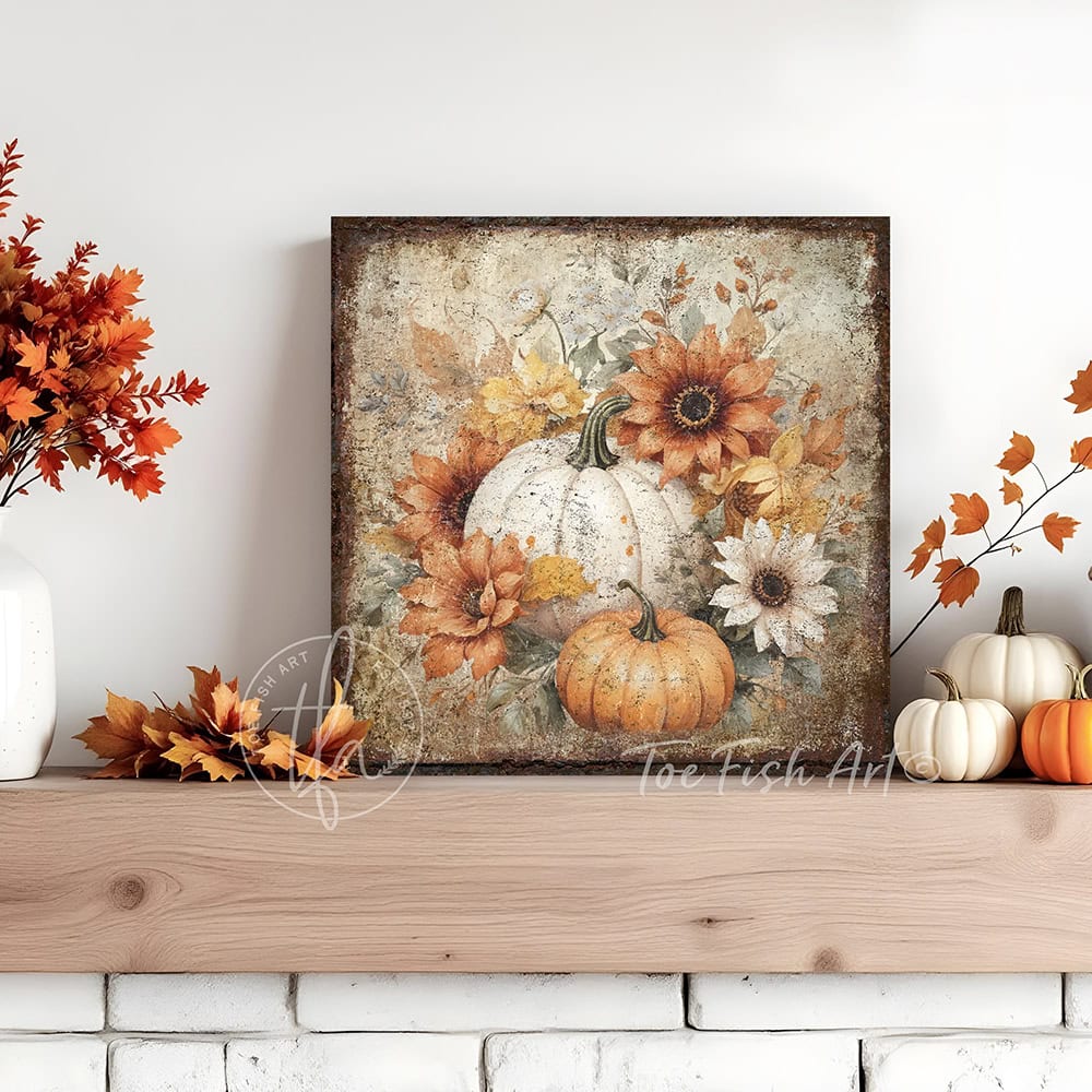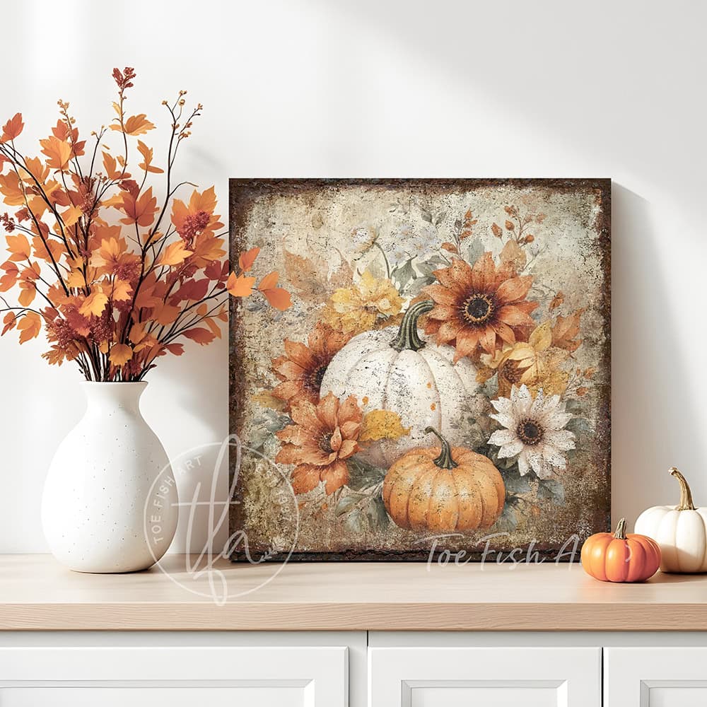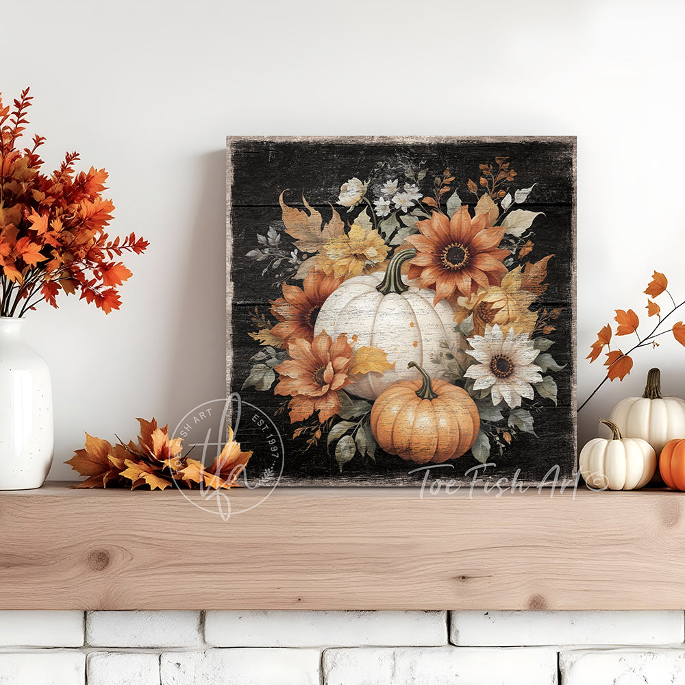 Rustic Fall Pumpkin and Sunflower Wall Art | Vintage Farmhouse Autumn Home Décor
