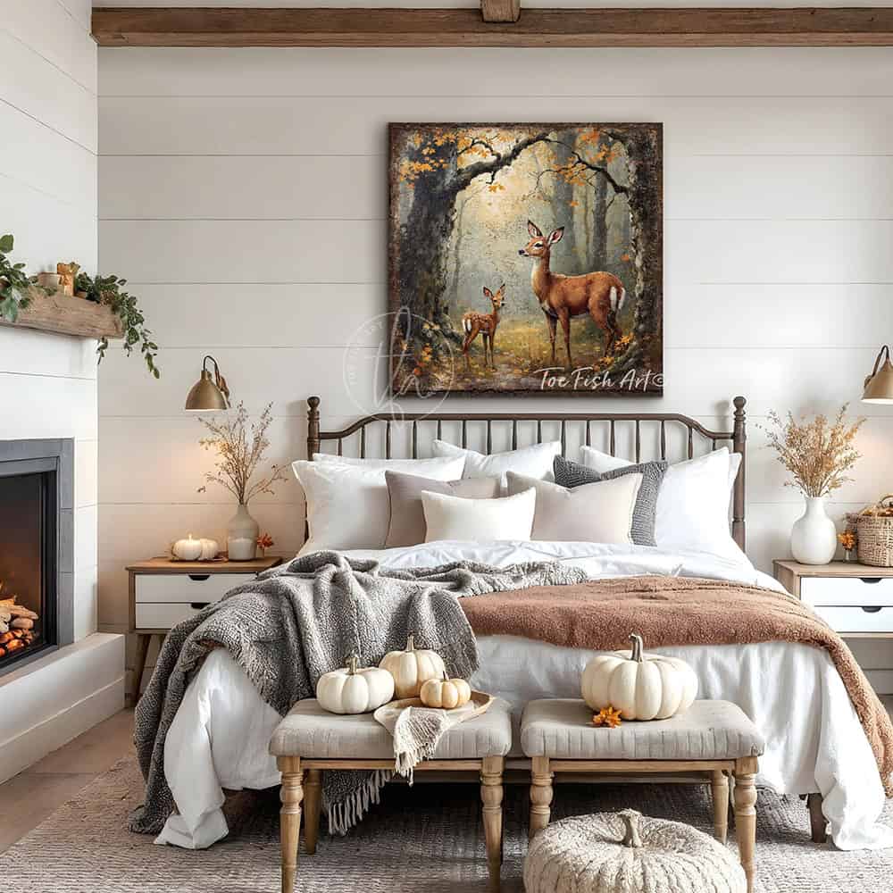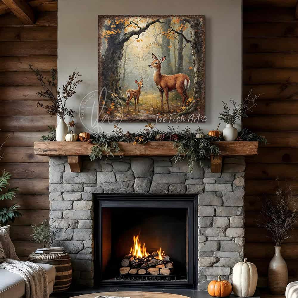 Mother Deer and Fawn in Autumn Forest Wall Art | Rustic Woodland Nature Canvas Print