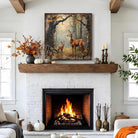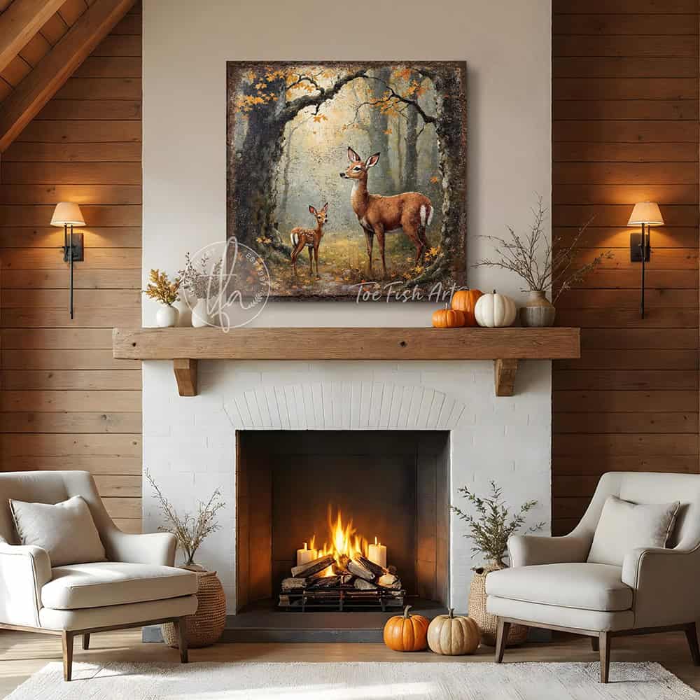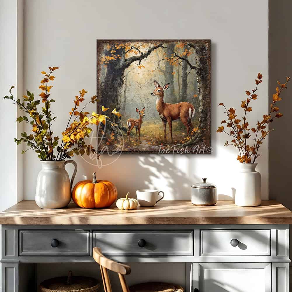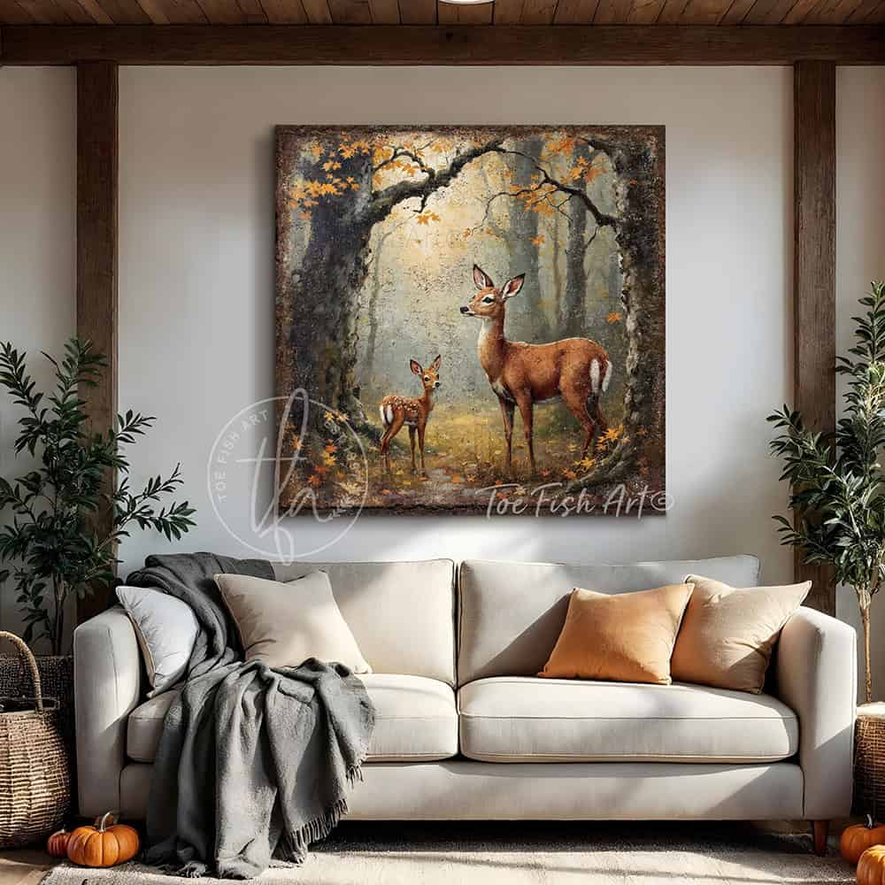 Mother Deer and Fawn in Autumn Forest Wall Art | Rustic Woodland Nature Canvas Print