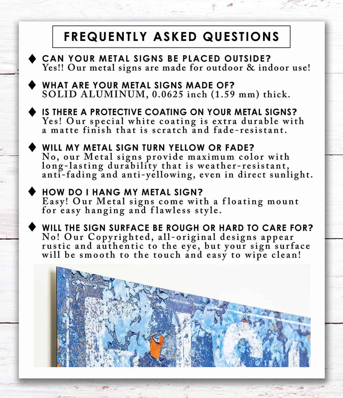 METAL signs can be hung from the pre-installed floating frame using wide-head screws to support the sign and “catch” the frame lip. Depending on your unique hanging surface and location, we’ve found that this outdoor-rated “Velcro” product, when applied along the entire length of all four sides (in addition to the screws), can assist with holding your sign in place for breezy conditions, uneven wall surfaces, and even to prevent signs from being bumped off the wall by people, pets, swinging doors, etc.: VELCRO Brand Extreme Outdoor Heavy Duty 15 lb. Complete list of FAQs