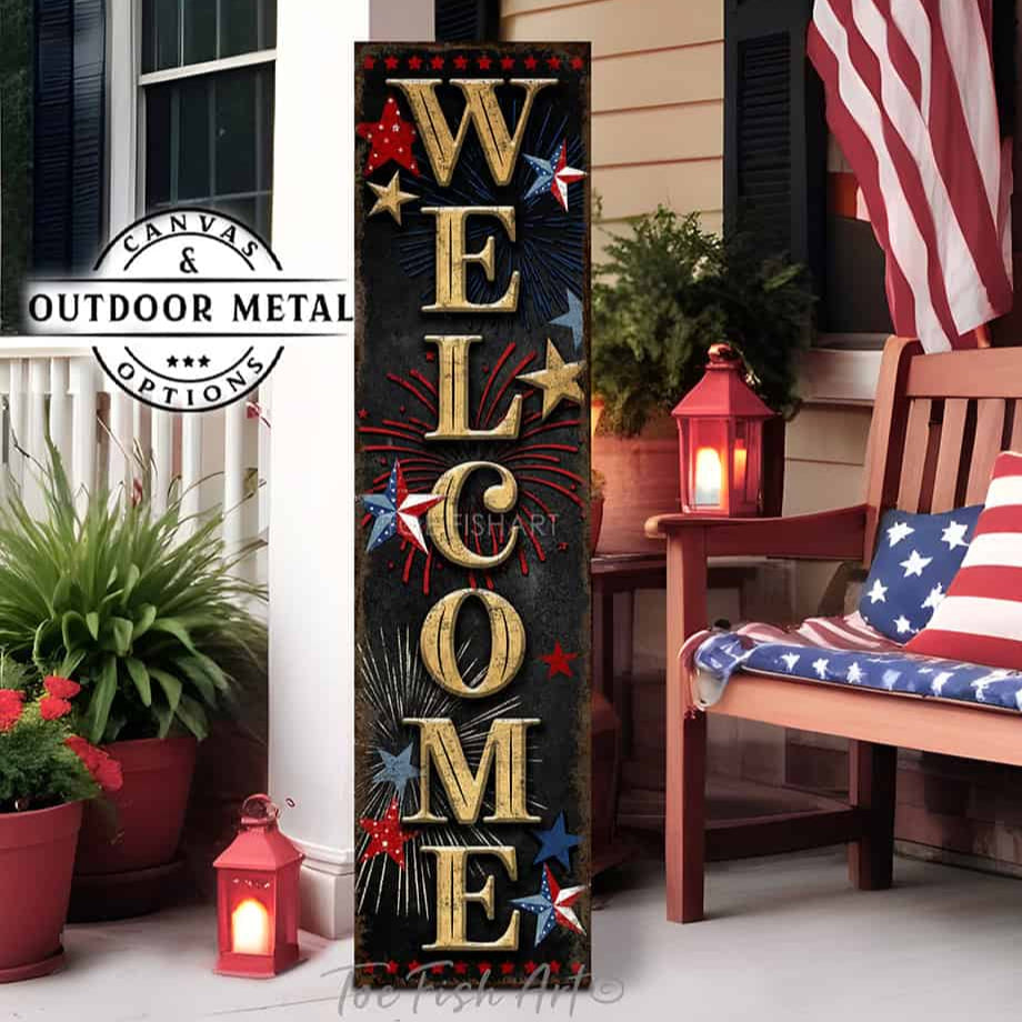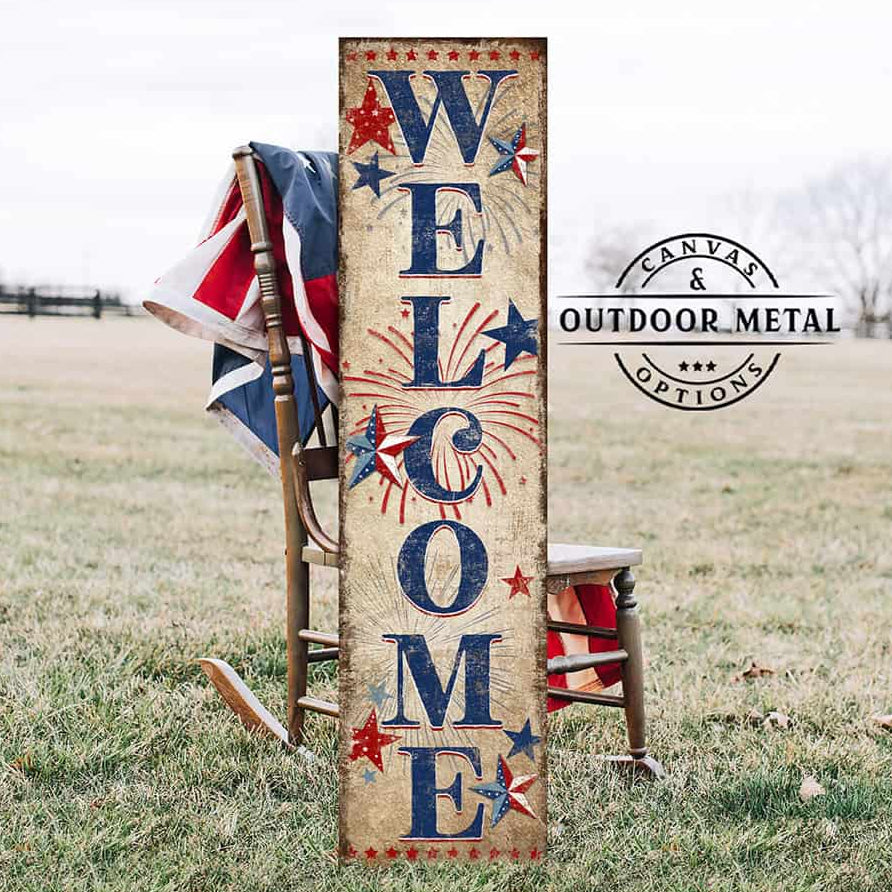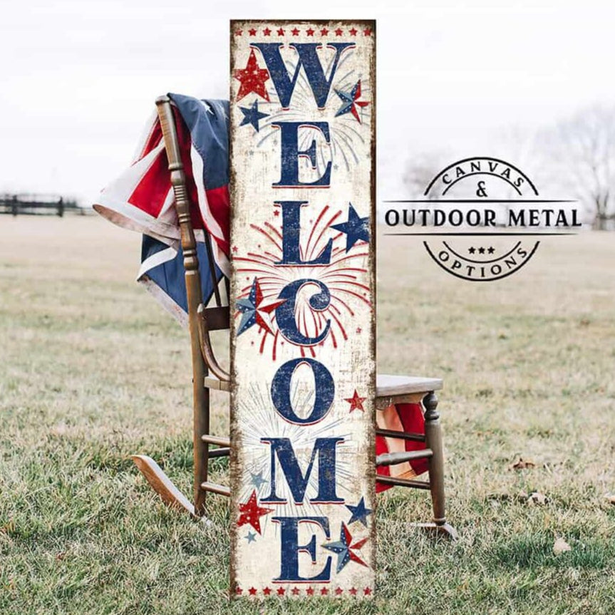 Patriotic Welcome 4th of July Canvas or Outdoor Metal Entryway Sign with Color Options