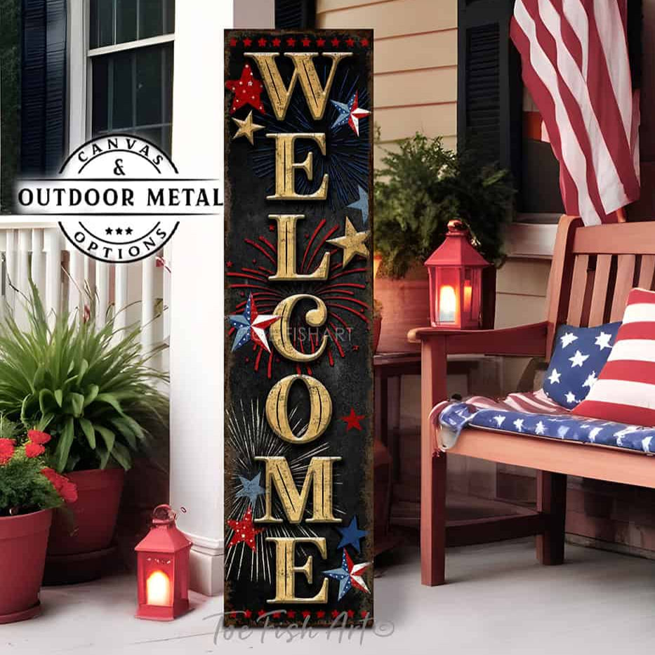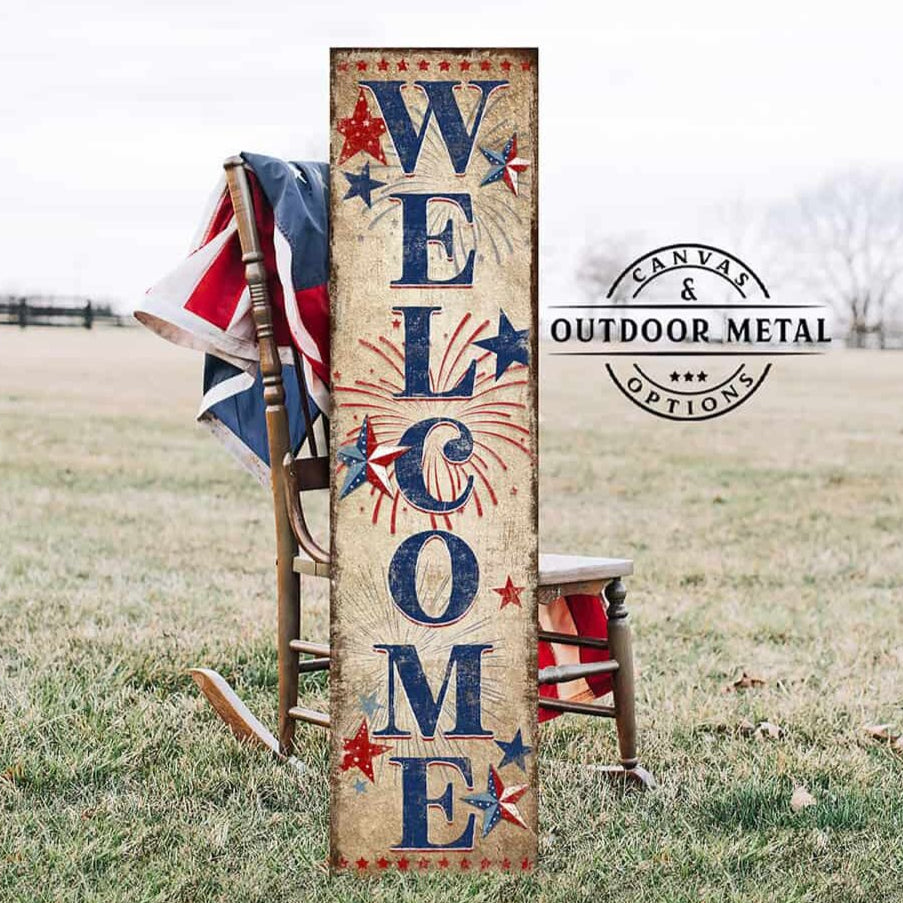 Patriotic Welcome 4th of July Canvas or Outdoor Metal Entryway Sign with Color Options