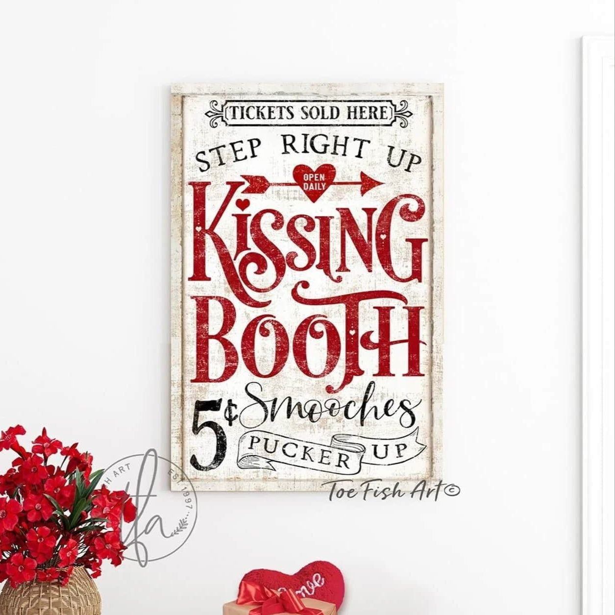 Kissing Booth Valentine's Day Seasonal Decoration Vertical Canvas or Metal Sign (color options)
