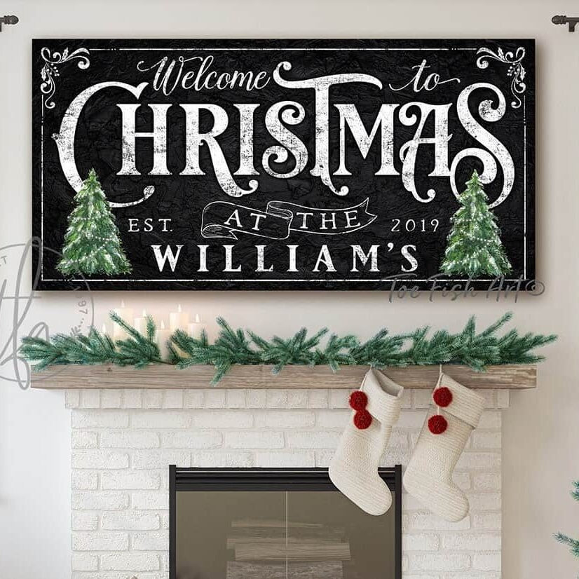 Welcome to Christmas Personalized Sign in Vintage Black with Lettering Color Options