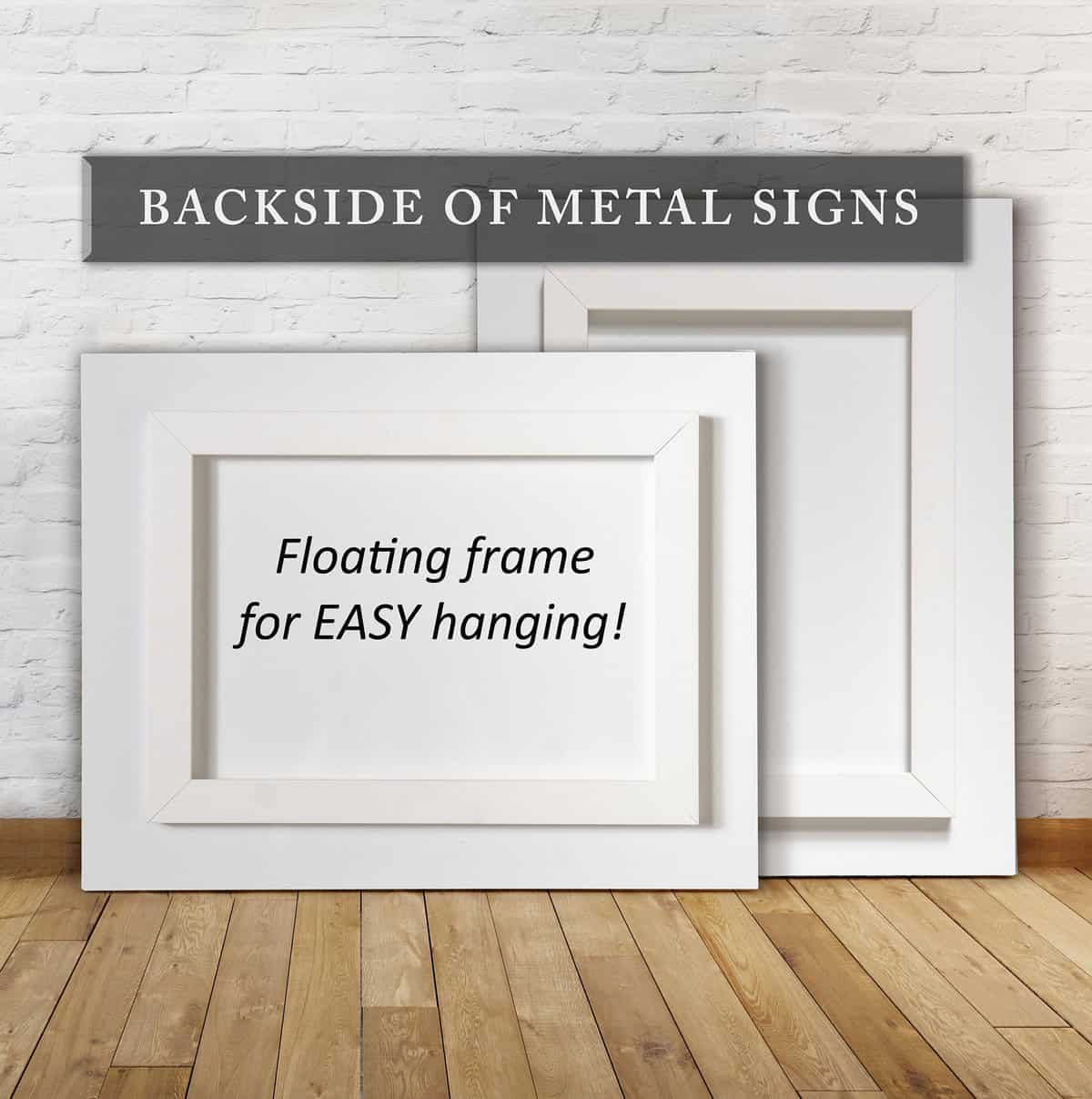 METAL signs can be hung from the pre-installed floating frame using wide-head screws to support the sign and “catch” the frame lip. Depending on your unique hanging surface and location, we’ve found that this outdoor-rated “Velcro” product, when applied along the entire length of all four sides (in addition to the screws), can assist with holding your sign in place for breezy conditions, uneven wall surfaces, and even to prevent signs from being bumped off the wall by people, pets, swinging doors, etc.: VELCRO Brand Extreme Outdoor Heavy Duty 15 lb. Complete list of FAQs